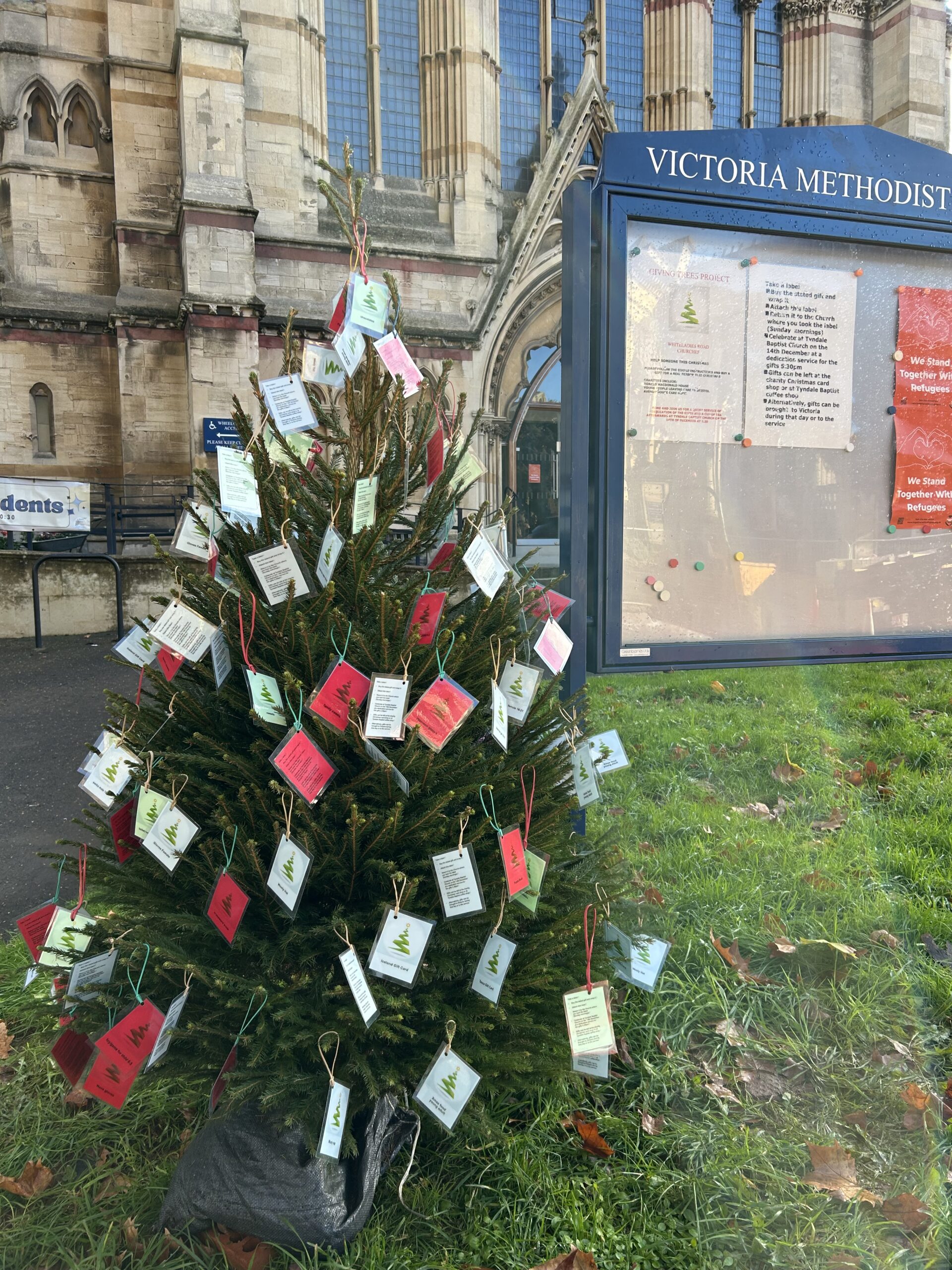 Christmas Tree with lots of labels hanging off it standing outside the church building